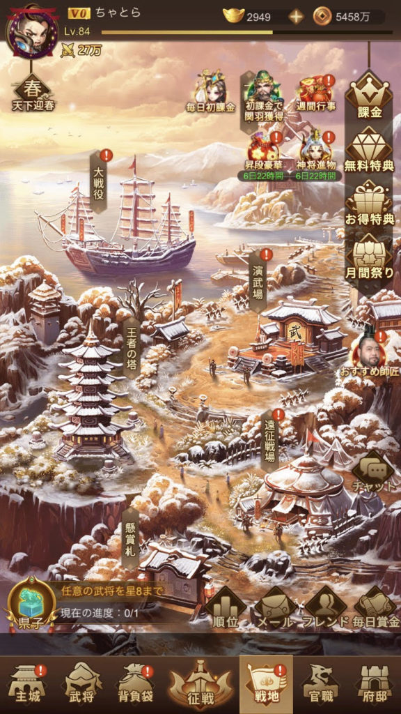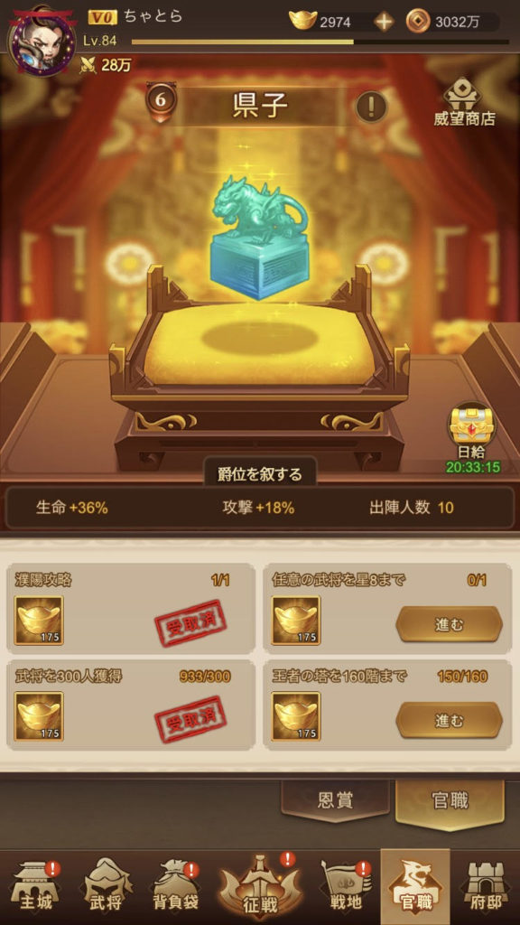 他にも府邸の施設強化や官職を上げることでキャラ全体のステータスアップも可能。